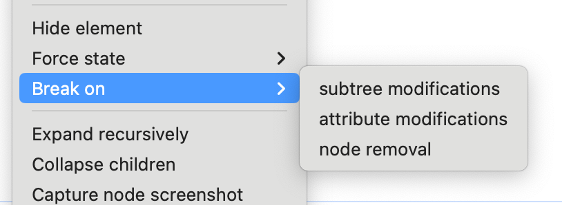 Go through your reproduction steps and wait until you hit the breakpoint. Only then use one of “Break on” options with the problematic elements and then resume script execution. Note that in the debugger sidebar, next to the lines of code, you can turn on and off individual breakpoints for quicker set up in subsequent runs.